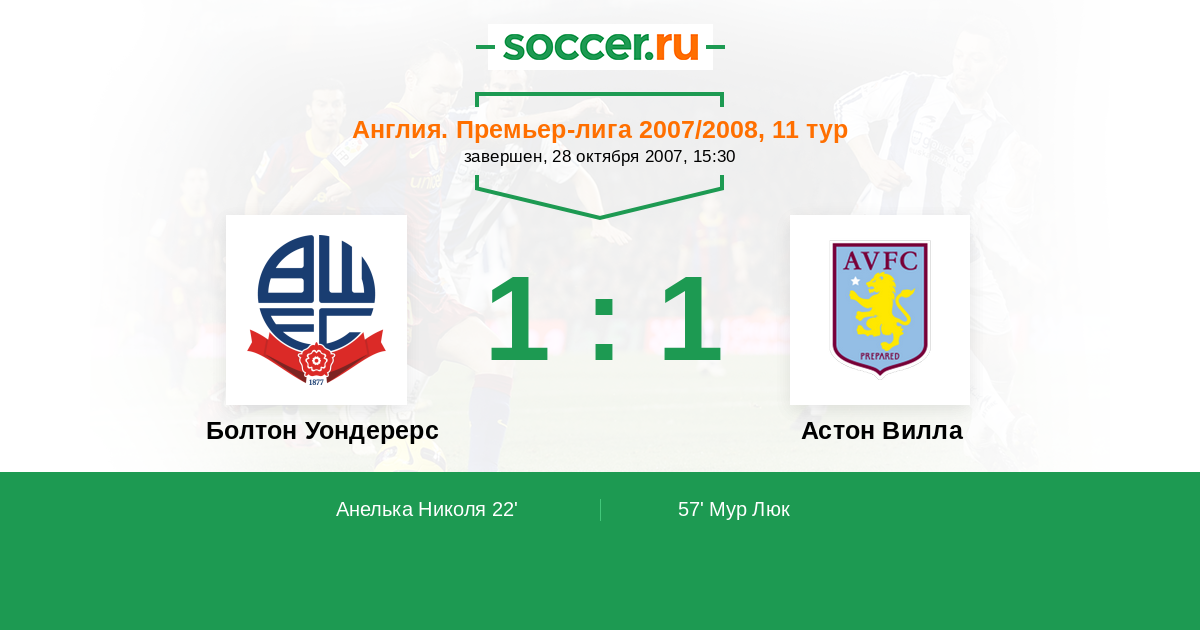 Протокол матча Болтон Уондерерс против Астон Вилла