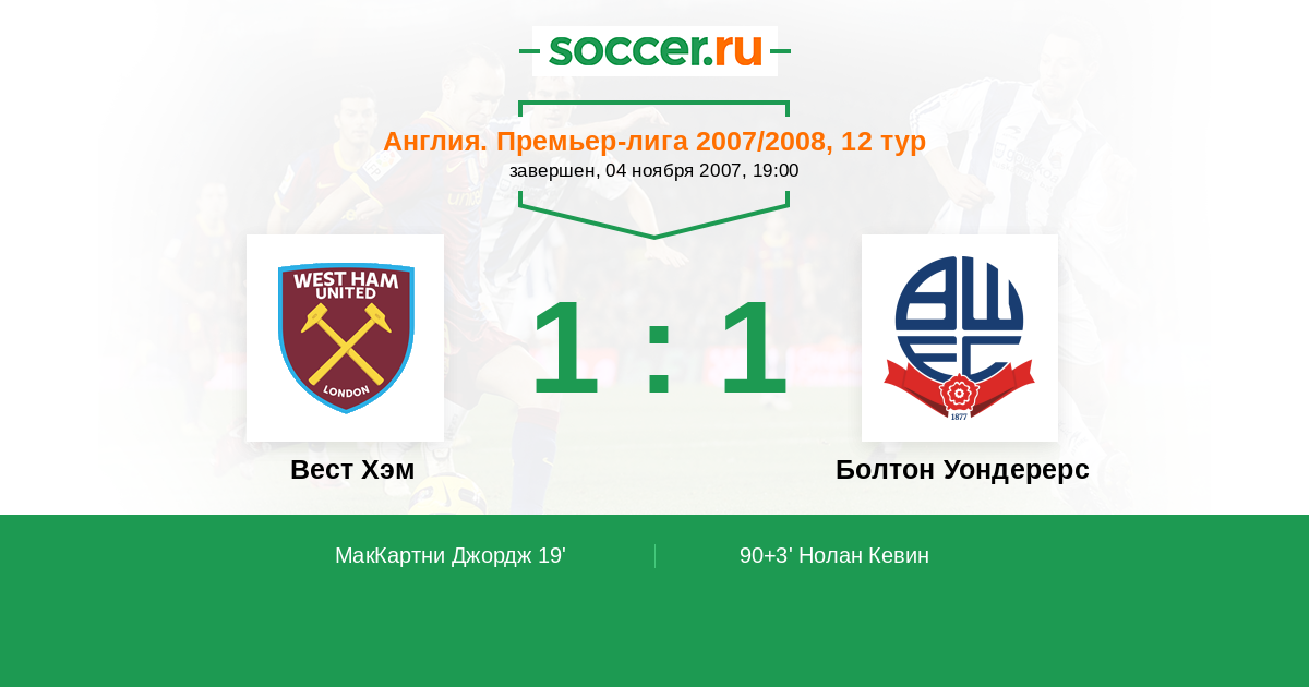 Протокол матча Вест Хэм против Болтон Уондерерс