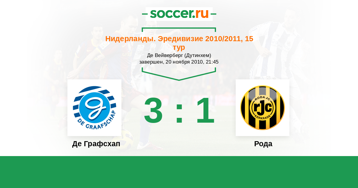 Нидерланды. Эредивизи 26.02.2011 Рода Логотип футбольный клуб Рода (Керкраде) 1:1 Логотип футбольный клуб Де Графсхап (Дутинхем) Де Графсхап