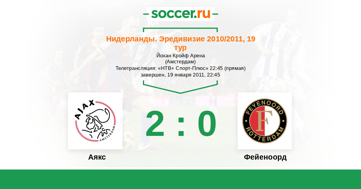 Нидерланды. Эредивизи 20.01.2013 Аякс Логотип футбольный клуб Аякс (Амстердам) 3:0 Логотип футбольный клуб Фейеноорд (Роттердам) Фейеноорд