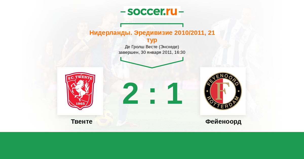 Нидерланды. Эредивизи 16.10.2010 Фейеноорд Логотип футбольный клуб Фейеноорд (Роттердам) 0:1 Логотип футбольный клуб Твенте (Энсхеде) Твенте