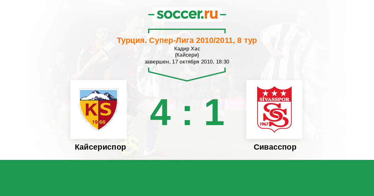 Турция. Суперлига 23.10.2011 Кайсериспор Логотип футбольный клуб Кайсериспор 6:2 Логотип футбольный клуб Сивасспор Сивасспор