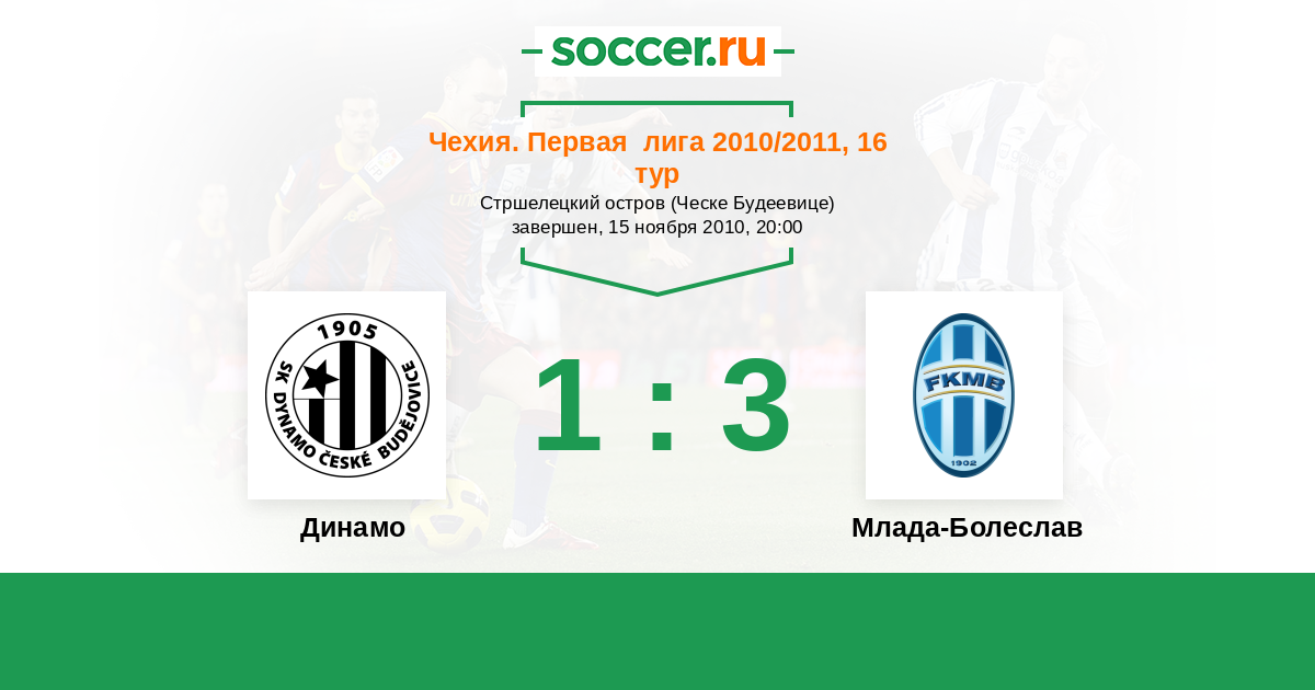 Чехия. Первая Лига 23.07.2010 Млада-Болеслав Логотип футбольный клуб Млада-Болеслав 1:1 Логотип футбольный клуб Динамо (Ческе-Будеевице) Динамо