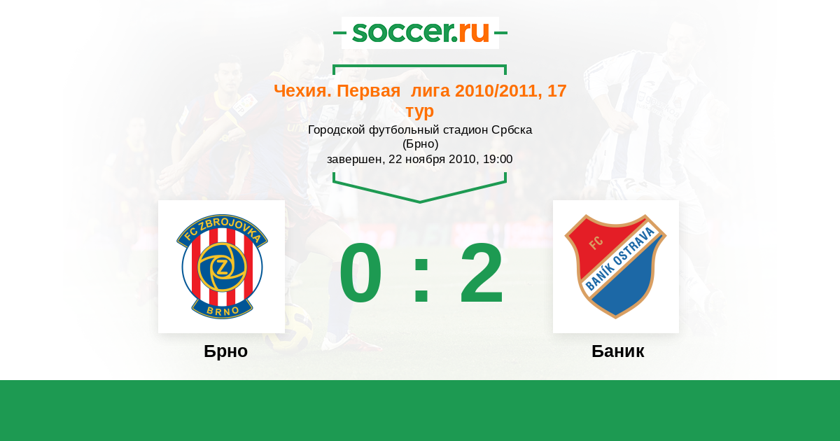 Чехия. Первая Лига 01.08.2010 Баник Логотип футбольный клуб Баник (Острава) 3:0 Логотип футбольный клуб Брно Брно
