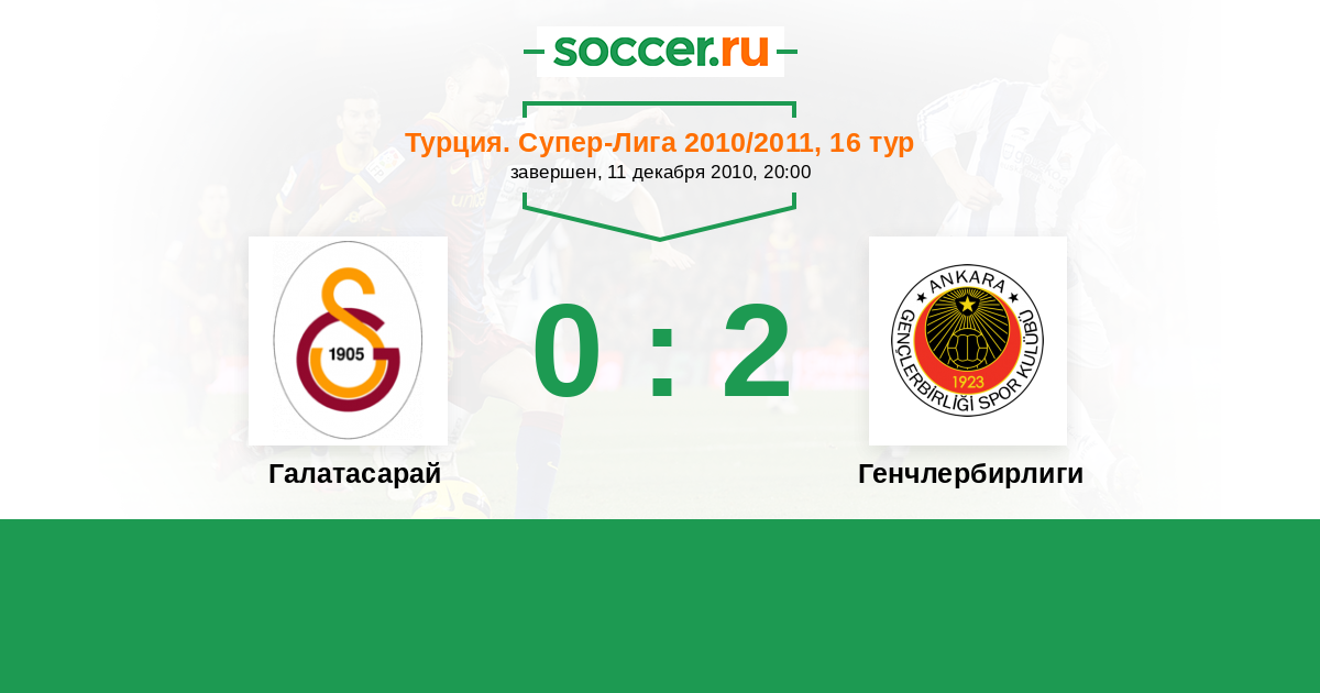 Турция. Суперлига 03.12.2011 Генчлербирлиги Логотип футбольный клуб Генчлербирлиги (Анкара) 0:1 Логотип футбольный клуб Галатасарай (Стамбул) Галатасарай