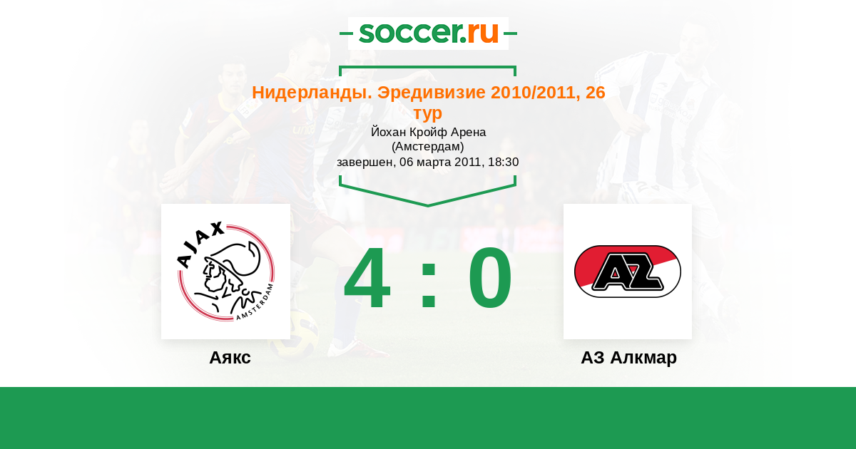 Нидерланды. Кубок 23.12.2010 Аякс Логотип футбольный клуб Аякс (Амстердам) 1:0 Логотип футбольный клуб АЗ Алкмар АЗ Алкмар