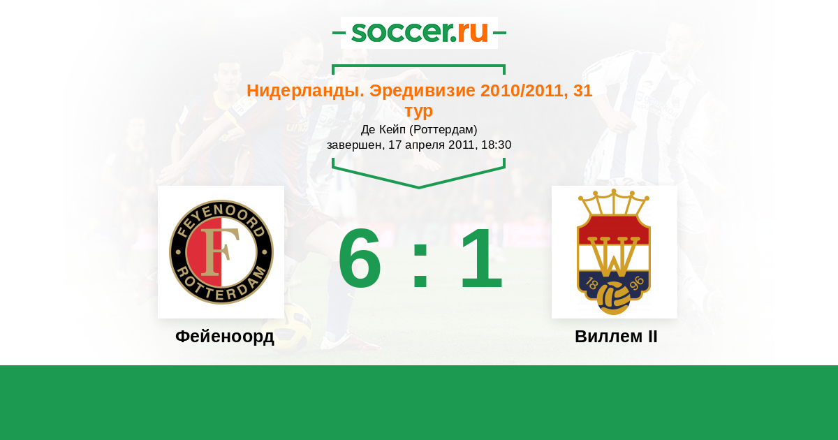 Нидерланды. Эредивизи 05.12.2010 Виллем II Логотип футбольный клуб Виллем II (Тилбург) 1:1 Логотип футбольный клуб Фейеноорд (Роттердам) Фейеноорд