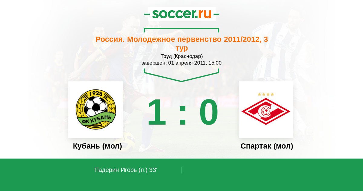 Протокол матча Кубань (мол) против Спартак (мол)