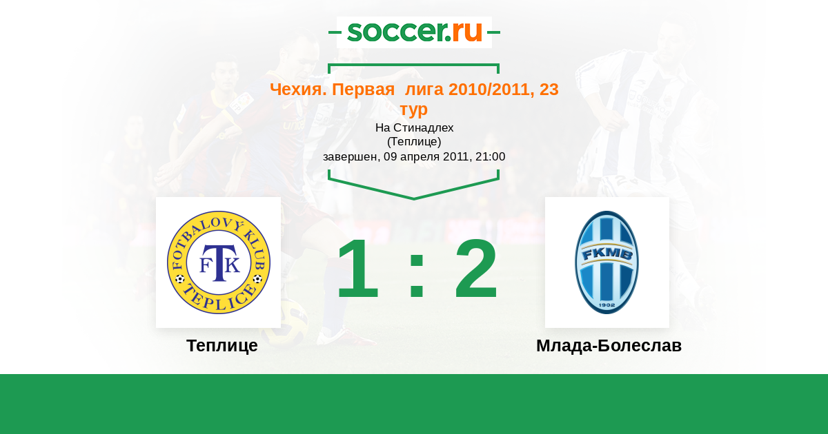 Чехия. Первая Лига 02.10.2011 Теплице Логотип футбольный клуб Теплице 1:3 Логотип футбольный клуб Млада-Болеслав Млада-Болеслав