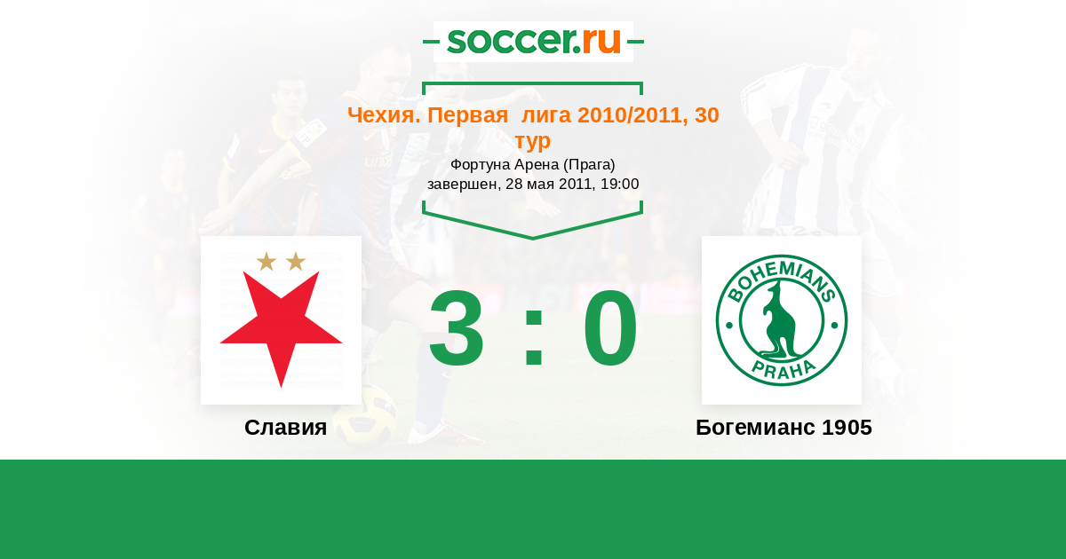 Чехия. Первая Лига 29.07.2011 Богемианс 1905 Логотип футбольный клуб Богемианс 1905 (Прага) 2:0 Логотип футбольный клуб Славия (Прага) Славия