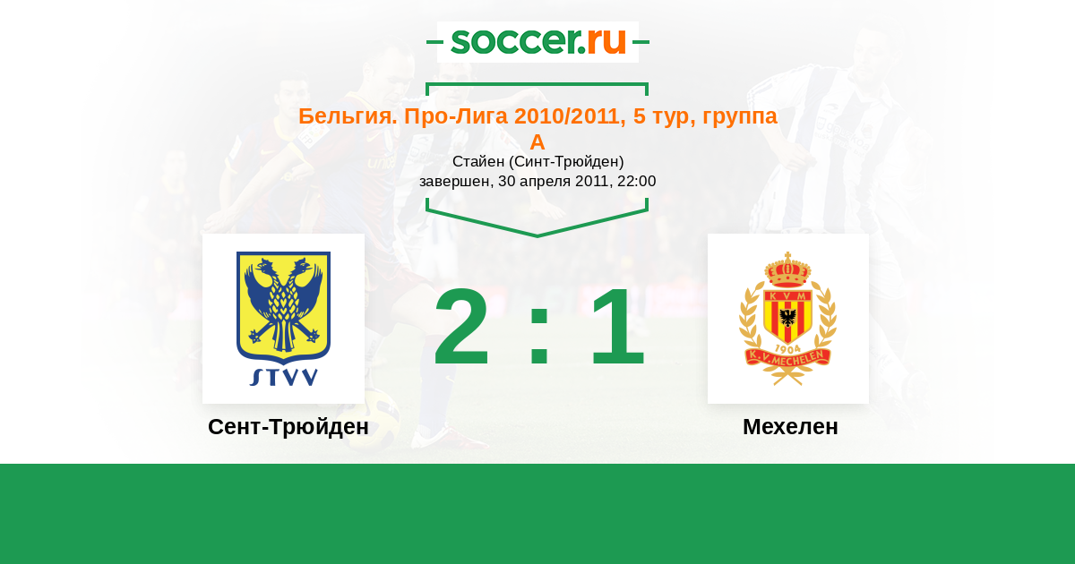 Бельгия. Про-Лига 02.04.2011 Мехелен Логотип футбольный клуб Мехелен 1:1 Логотип футбольный клуб Сент-Трюйден (Синт-Трёйден) Сент-Трюйден