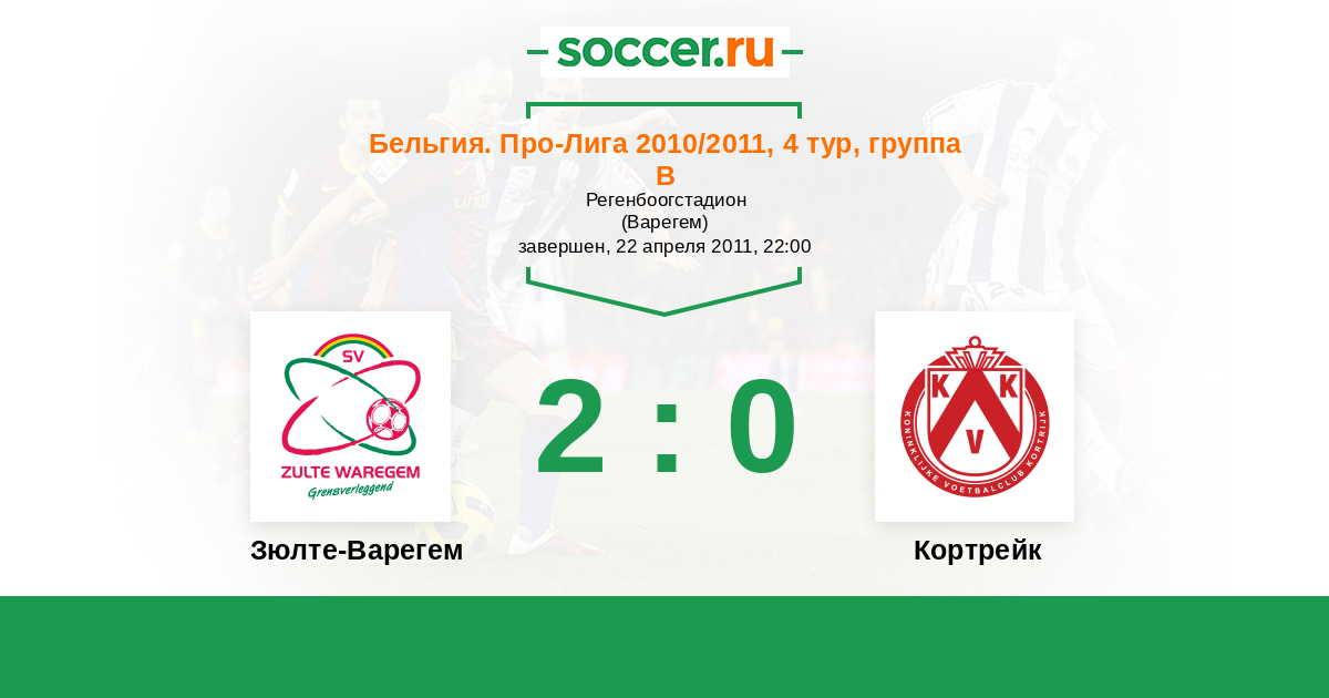 Бельгия. Про-Лига 19.03.2011 Кортрейк Логотип футбольный клуб Кортрейк 2:2 Логотип футбольный клуб Зюлте-Варегем Зюлте-Варегем