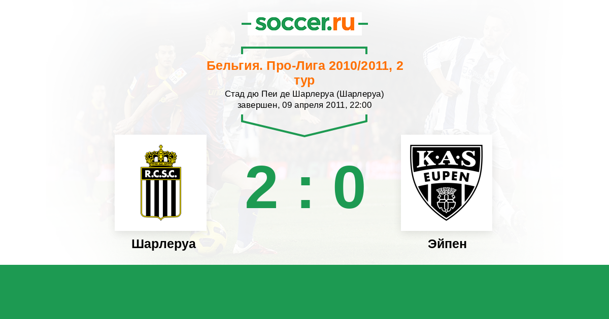 Бельгия. Про-Лига 02.04.2011 Эйпен Логотип футбольный клуб Эйпен 3:2 Логотип футбольный клуб Шарлеруа Шарлеруа
