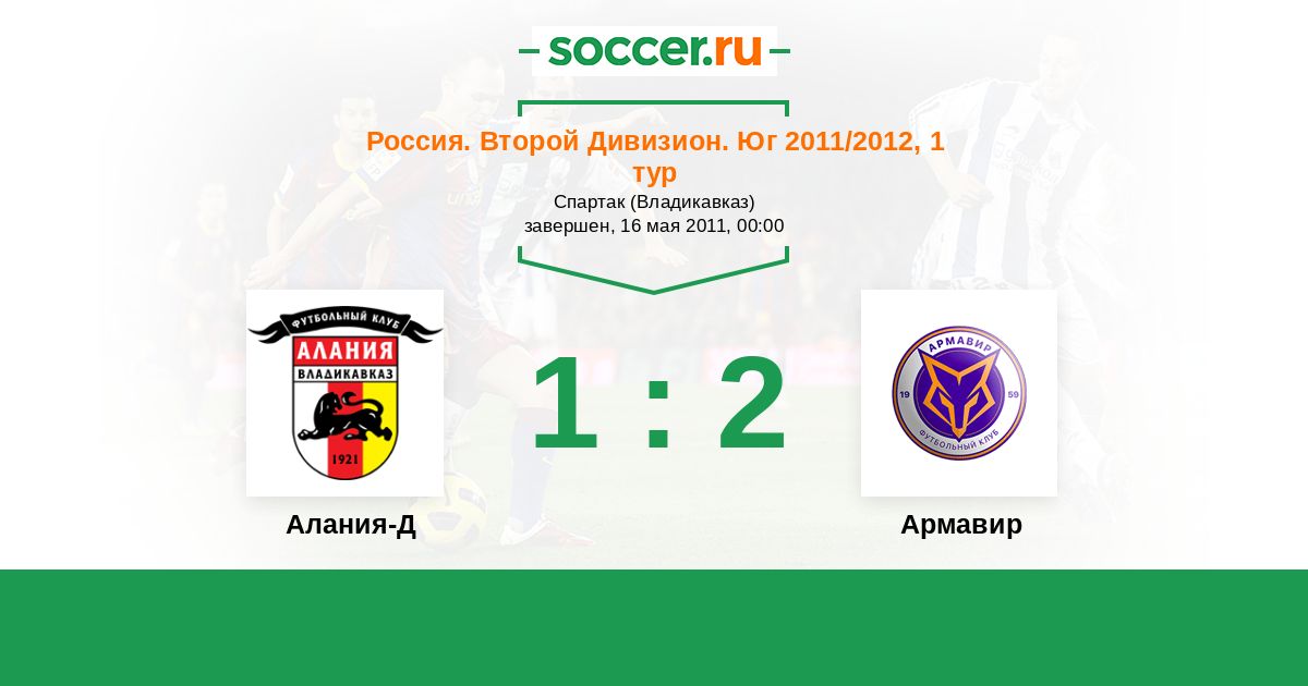 Россия. Вторая лига. Группа 1 31.05.2012 Торпедо Армавир Логотип футбольный клуб Торпедо Армавир 3:0 Логотип футбольный клуб Алания-Д (Владикавказ) Алания-Д