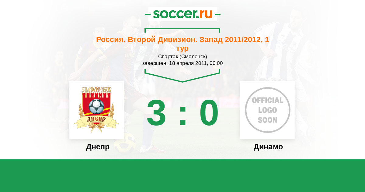 Россия. Вторая лига. Группа 2 07.10.2011 Днепр Логотип футбольный клуб Днепр (Смоленск) 4:0 Логотип футбольный клуб Динамо (Кострома) Динамо