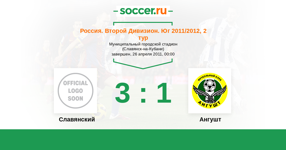Россия. Вторая лига. Группа 1 04.09.2011 Ангушт Логотип футбольный клуб Ангушт (Назрань) 2:0 Логотип футбольный клуб Славянский (Славянск-на-Кубани) Славянский