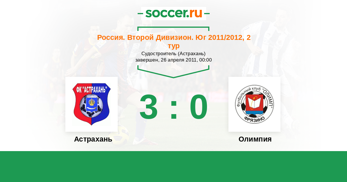 Россия. Вторая лига. Группа 1 04.09.2011 Олимпия Логотип футбольный клуб Олимпия (Геленджик) 1:2 Логотип футбольный клуб Астрахань Астрахань