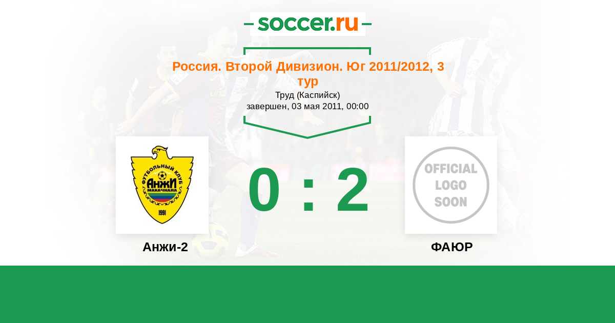Россия. Вторая лига. Группа 1 19.05.2012 ФАЮР Логотип футбольный клуб ФАЮР (Беслан) 1:4   Ангушт