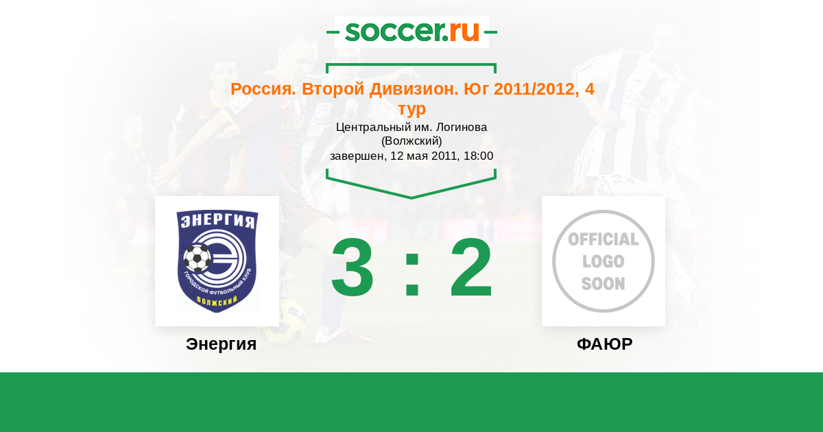 Россия. Вторая лига. Группа 1 18.09.2011 ФАЮР Логотип футбольный клуб ФАЮР (Беслан) 2:2 Логотип футбольный клуб Энергия (Волжский) Энергия