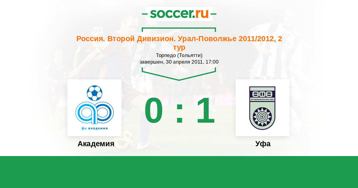 Россия. Вторая лига. Группа 4 13.07.2011 Уфа Логотип футбольный клуб Уфа 0:0 Логотип футбольный клуб Академия (Тольятти) Академия