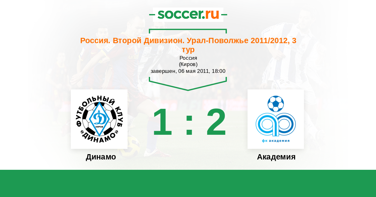 Россия. Вторая лига. Группа 4 20.07.2011 Академия Логотип футбольный клуб Академия (Тольятти) 5:0 Логотип футбольный клуб Динамо Киров Динамо Киров