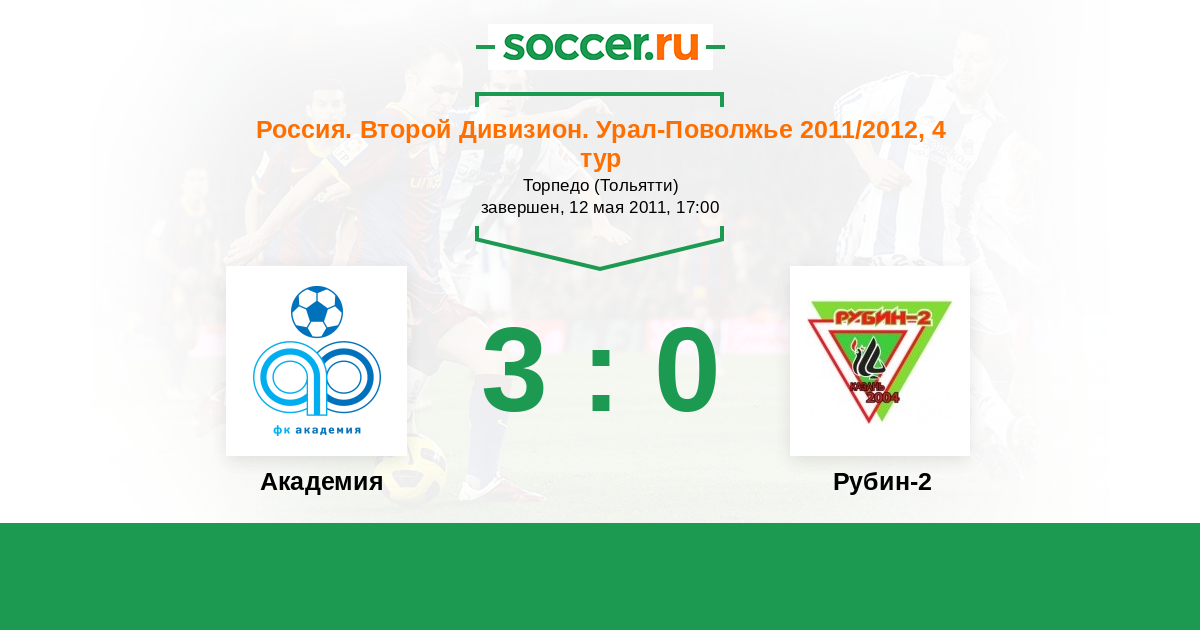 Россия. Вторая лига. Группа 4 04.08.2011 Рубин-2 Логотип футбольный клуб Рубин-2 (Казань) 0:3 Логотип футбольный клуб Академия (Тольятти) Академия