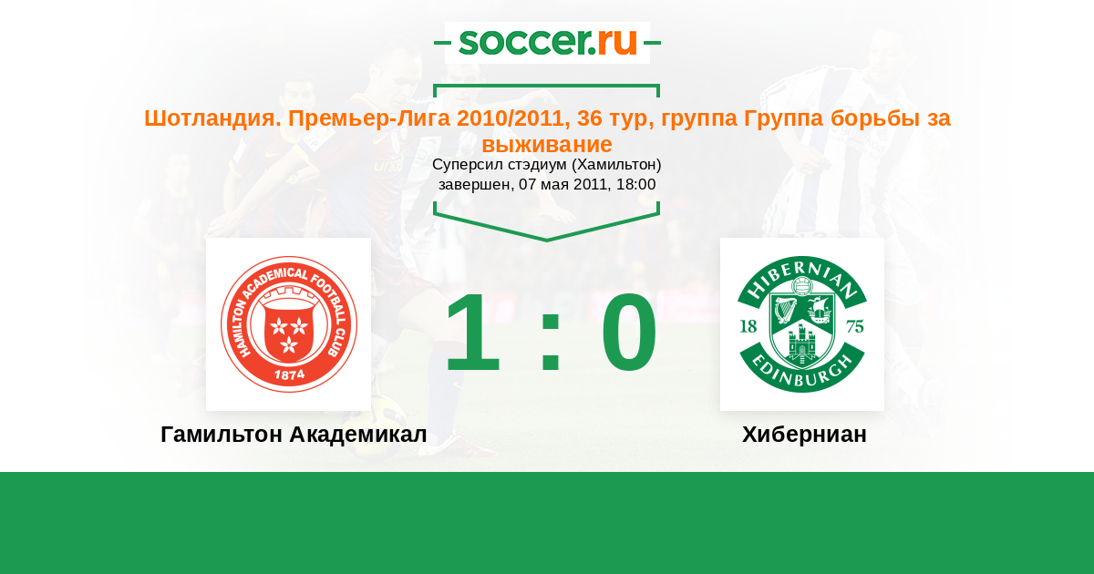Шотландия. Премьер-Лига 17.04.2011 Хиберниан Логотип футбольный клуб Хиберниан (Эдинбург) 1:2 Логотип футбольный клуб Гамильтон Академикал Гамильтон Академикал