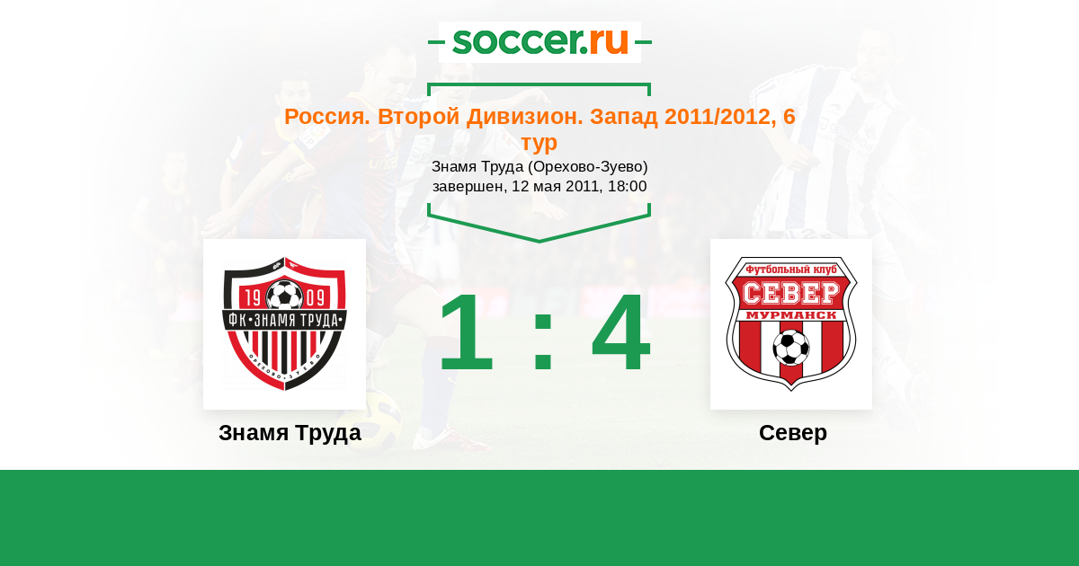 Россия. Вторая лига. Группа 2 24.05.2014 Север Логотип футбольный клуб Север (Мурманск) 0:0 Логотип футбольный клуб Знамя Труда (Орехово-Зуево) Знамя Труда