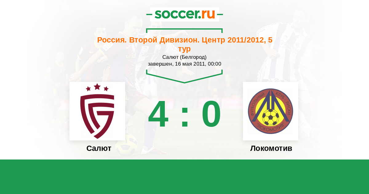 Россия. Вторая лига. Группа 3 17.04.2012 Салют Логотип футбольный клуб Салют (Белгород) 2:1 Логотип футбольный клуб Локомотив (Лиски) Локомотив