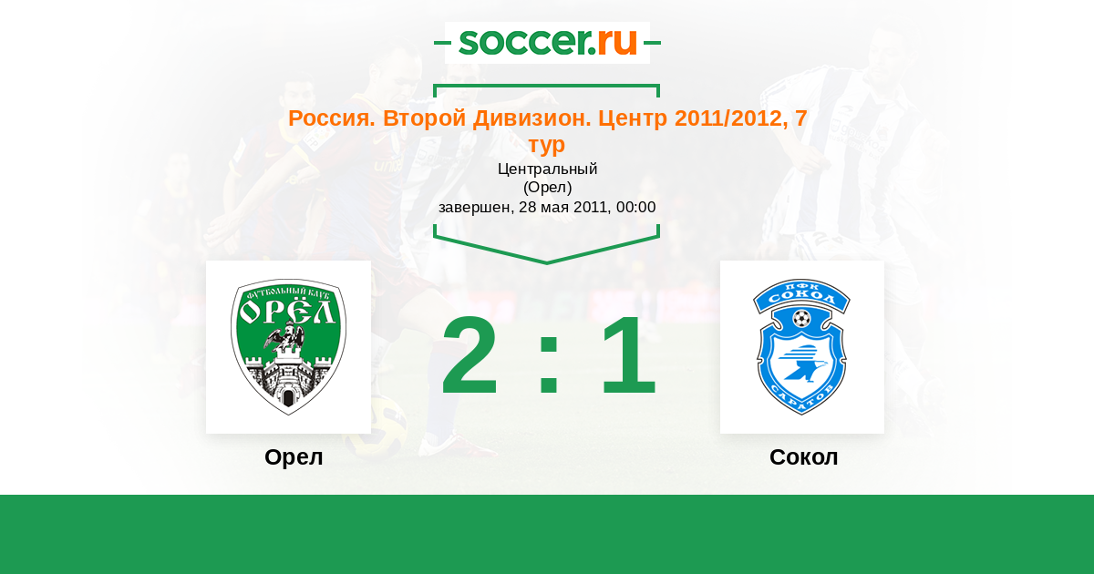 Россия. Вторая лига. Группа 3 23.08.2011 Сокол Логотип футбольный клуб Сокол (Саратов) 3:1 Логотип футбольный клуб Орел Орел