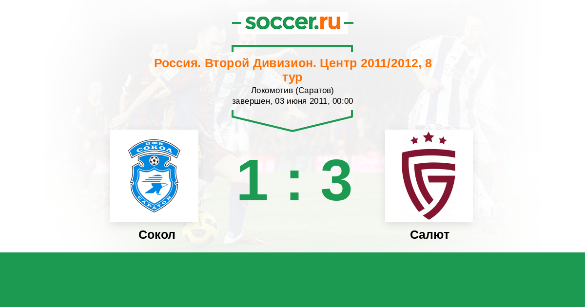 Россия. Вторая лига. Группа 3 05.05.2012 Сокол Логотип футбольный клуб Сокол (Саратов) 2:2 Логотип футбольный клуб Салют (Белгород) Салют