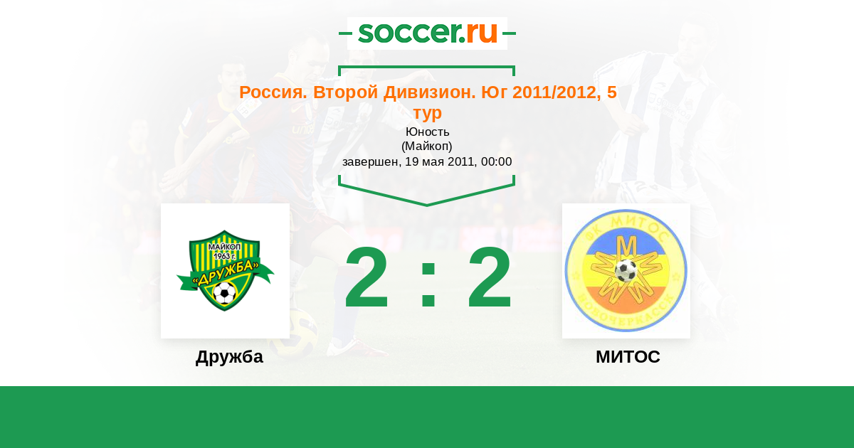 Россия. Вторая лига. Группа 1 26.09.2011 МИТОС Логотип футбольный клуб МИТОС (Новочеркасск) 0:1 Логотип футбольный клуб Дружба (Майкоп) Дружба