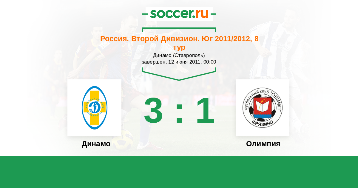 Россия. Вторая лига. Группа 1 16.10.2011 Олимпия Логотип футбольный клуб Олимпия (Геленджик) 1:0   Динамо Ставрополь