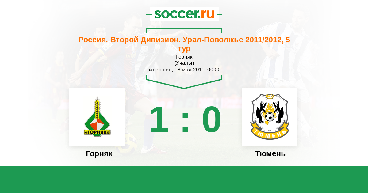 Россия. Вторая лига. Группа 4 10.08.2011 Тюмень Логотип футбольный клуб Тюмень 1:1 Логотип футбольный клуб Горняк (Учалы) Горняк
