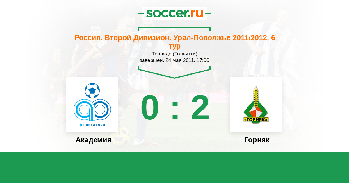 Россия. Вторая лига. Группа 4 16.08.2011 Горняк Логотип футбольный клуб Горняк (Учалы) 2:1 Логотип футбольный клуб Академия (Тольятти) Академия