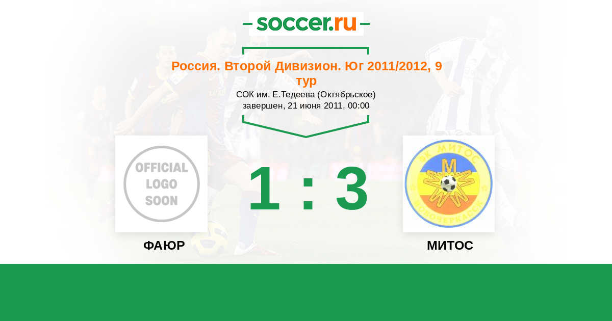 Россия. Вторая лига. Группа 1 23.10.2011 МИТОС Логотип футбольный клуб МИТОС (Новочеркасск) 4:0 Логотип футбольный клуб ФАЮР (Беслан) ФАЮР