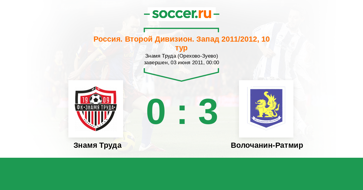 Россия. Вторая лига. Группа 2 05.05.2012 Знамя Труда Логотип футбольный клуб Знамя Труда (Орехово-Зуево) 2:0 Логотип футбольный клуб Волочанин-Ратмир (Вышний Волочек) Волочанин-Ратмир
