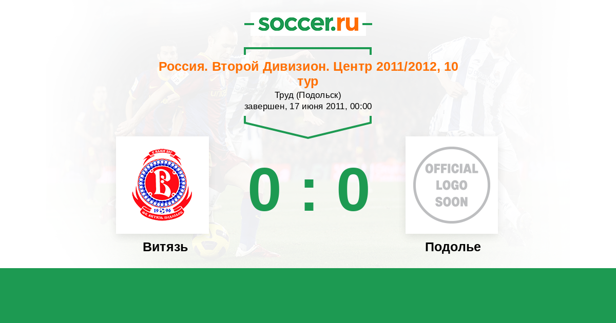 Россия. Вторая лига. Группа 3 10.09.2011 Подолье Логотип футбольный клуб Подолье (Подольский район) 2:3 Логотип футбольный клуб Витязь (Подольск) Витязь