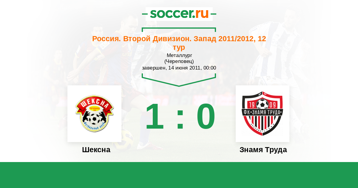 Россия. Вторая лига. Группа 2 11.09.2011 Знамя Труда Логотип футбольный клуб Знамя Труда (Орехово-Зуево) 0:2 Логотип футбольный клуб Шексна (Череповец) Шексна