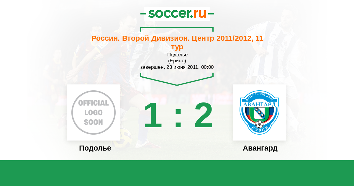 Россия. Вторая лига. Группа 3 23.05.2012 Подолье Логотип футбольный клуб Подолье (Подольский район) 2:1 Логотип футбольный клуб Авангард (Курск) Авангард
