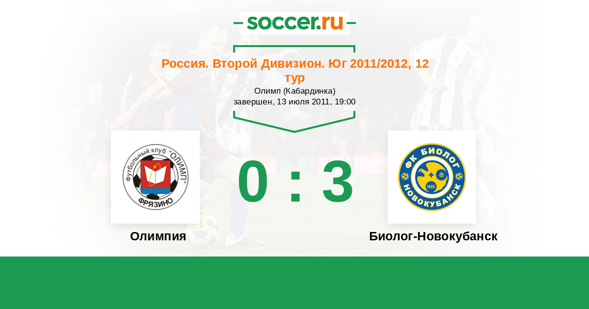 Россия. Вторая лига. Группа 1 25.04.2012 Биолог-Новокубанск Логотип футбольный клуб Биолог-Новокубанск 2:2 Логотип футбольный клуб Олимпия (Геленджик) Олимпия