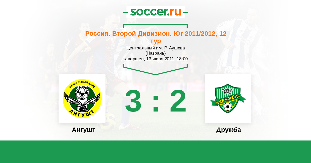 Россия. Вторая лига. Группа 1 25.04.2012 Дружба Логотип футбольный клуб Дружба (Майкоп) 0:3 Логотип футбольный клуб Ангушт (Назрань) Ангушт