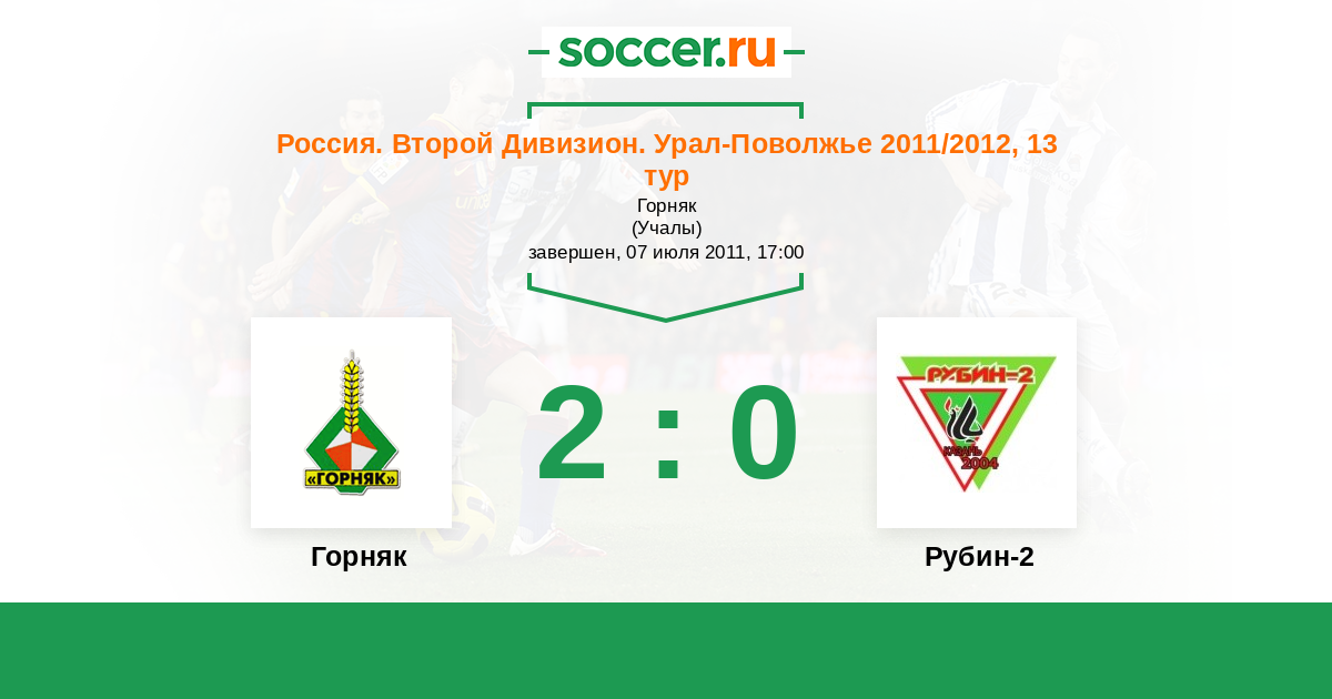 Россия. Вторая лига. Группа 4 29.09.2011 Рубин-2 Логотип футбольный клуб Рубин-2 (Казань) 2:2 Логотип футбольный клуб Горняк (Учалы) Горняк