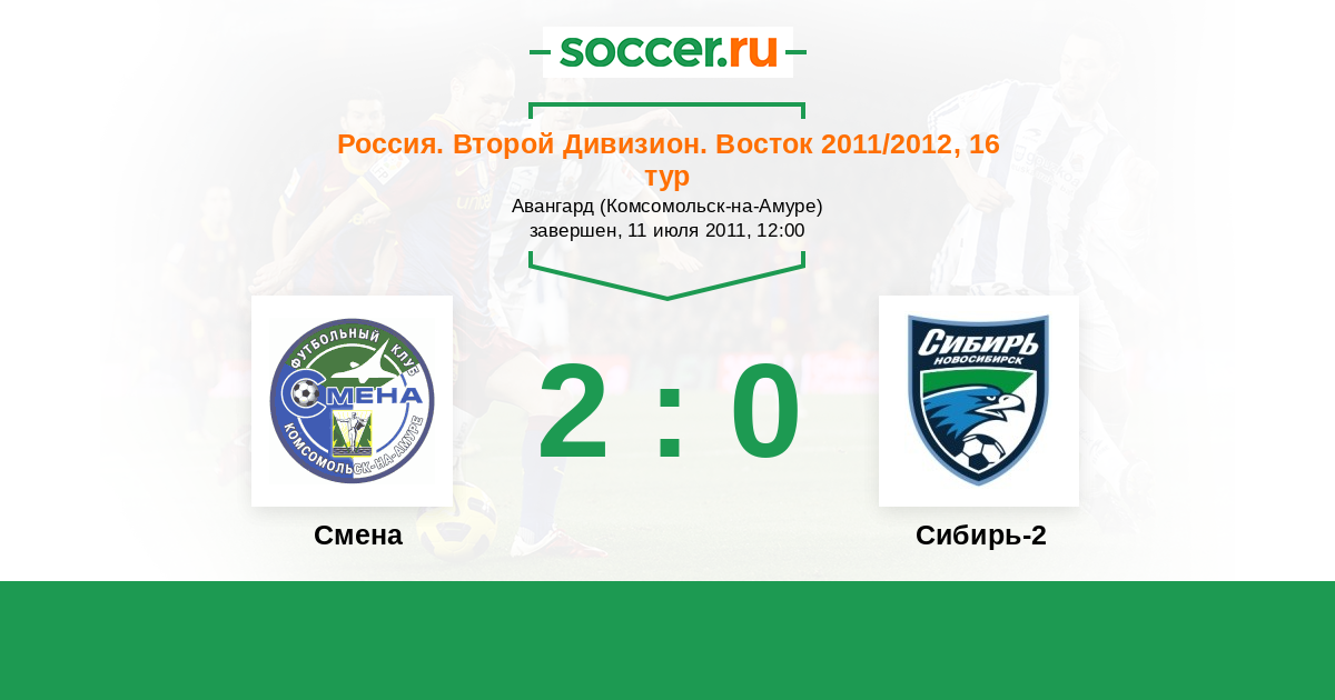 Россия. 2-й дивизион. Восток 30.06.2011 Сибирь-2 Логотип футбольный клуб Сибирь-2 (Новосибирск) 1:1 Логотип футбольный клуб Смена (Комсомольск-на-Амуре) Смена