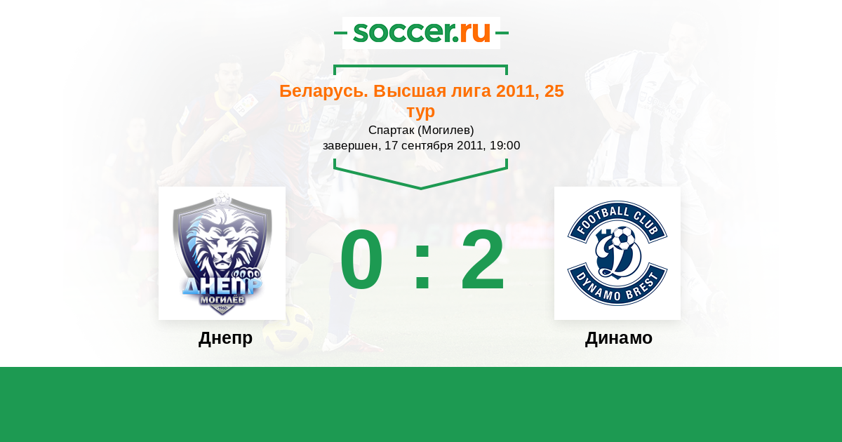 Беларусь. Высшая лига 30.04.2011 Динамо Логотип футбольный клуб Динамо (Брест) 2:0 Логотип футбольный клуб Днепр (Могилев) Днепр