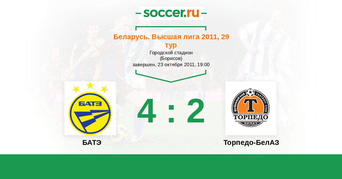 Беларусь. Высшая лига 09.07.2011 Торпедо-БелАЗ Логотип футбольный клуб Торпедо-БелАЗ (Жодино) 0:3 Логотип футбольный клуб БАТЭ (Борисов) БАТЭ