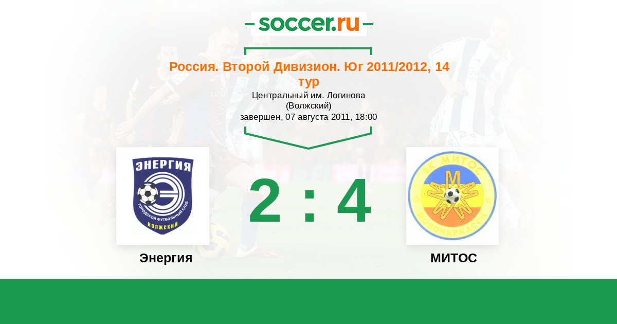 Россия. Вторая лига. Группа 1 27.08.2012 МИТОС Логотип футбольный клуб МИТОС (Новочеркасск) 4:0 Логотип футбольный клуб Энергия (Волжский) Энергия