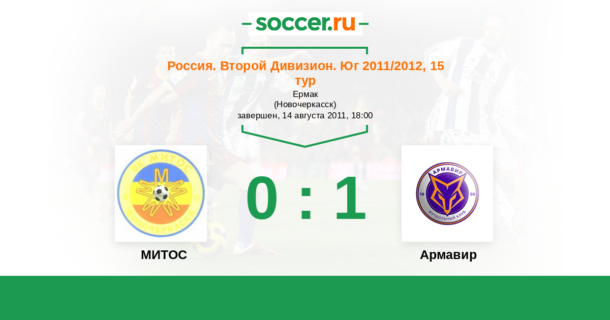 Россия. Вторая лига. Группа 1 13.05.2012 Торпедо Армавир Логотип футбольный клуб Торпедо Армавир 1:0 Логотип футбольный клуб МИТОС (Новочеркасск) МИТОС