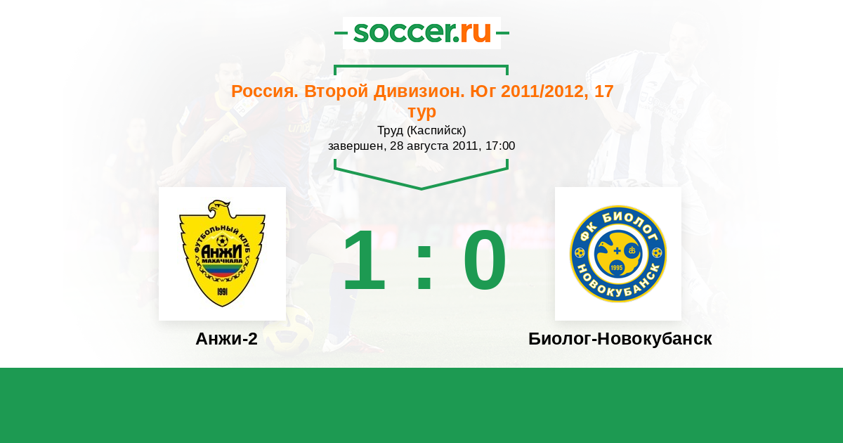 Россия. Вторая лига. Группа 1 16.09.2017 Биолог-Новокубанск Логотип футбольный клуб Биолог-Новокубанск 3:2 Логотип футбольный клуб Анжи-2 (Махачкала) Анжи-2