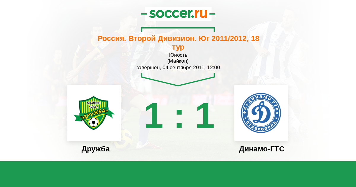 Россия. Вторая лига. Группа 1 14.04.2015 Дружба Логотип футбольный клуб Дружба (Майкоп) 1:1 Логотип футбольный клуб Динамо-ГТС (Ставрополь) Динамо-ГТС